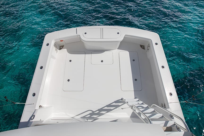 Underneath the coaming, tricolor LED lighting illuminates the cockpit. An aluminum mounting plate is laminated in the deck to accommodate a fishing chair or rocket launcher, and flush-mounted rod holders are conveniently placed. To port is a bait freezer inside a molded console with a removable fiberglass tray to handle a day’s worth of rigged