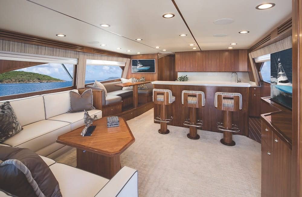 A fiberglass, electric sliding door leads to the salon. While the cockpit is all about fishing, the yacht’s interior is elegant and plush. Viking’s partner, WBC Design, created an exquisite environment of beauty and detail that is accentuated by Viking’s walnut joinery throughout. A dayhead is to starboard immediately inside the door. To port, an L-shaped Dewberry sofa with stowage below and a hi-low cocktail table address the home theater on the starboard side, a 49-inch HD TV that rises from the walnut cabinetry. Forward on the port side is a four-seat walnut dinette on a raised platform, which conceals a sizeable drawer that slides out to accommodate fishing rods and other gear. The bulkhead forward of the dinette is a perfect spot for another HD TV that can also serve as a monitor to show the yacht’s electronic displays from the flying bridge.