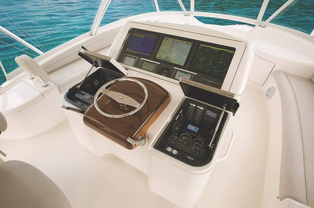 It took a half hour of turning and cutting across the wakes before I could get so much as a few drops on the foredeck. Looking astern gives more clues to the bottom’s geometry: a very clean wake and minimal rooster tail. Even backing down was revealing, as the transom crown pushes water to the sides instead of digging in. The Viking 68 also utilizes the company’s proprietary VIPER steering with programmable independent rudders, which gives the boat amazing maneuverability matched to the swift throttle response from the quiet and clean-running MTU engines.