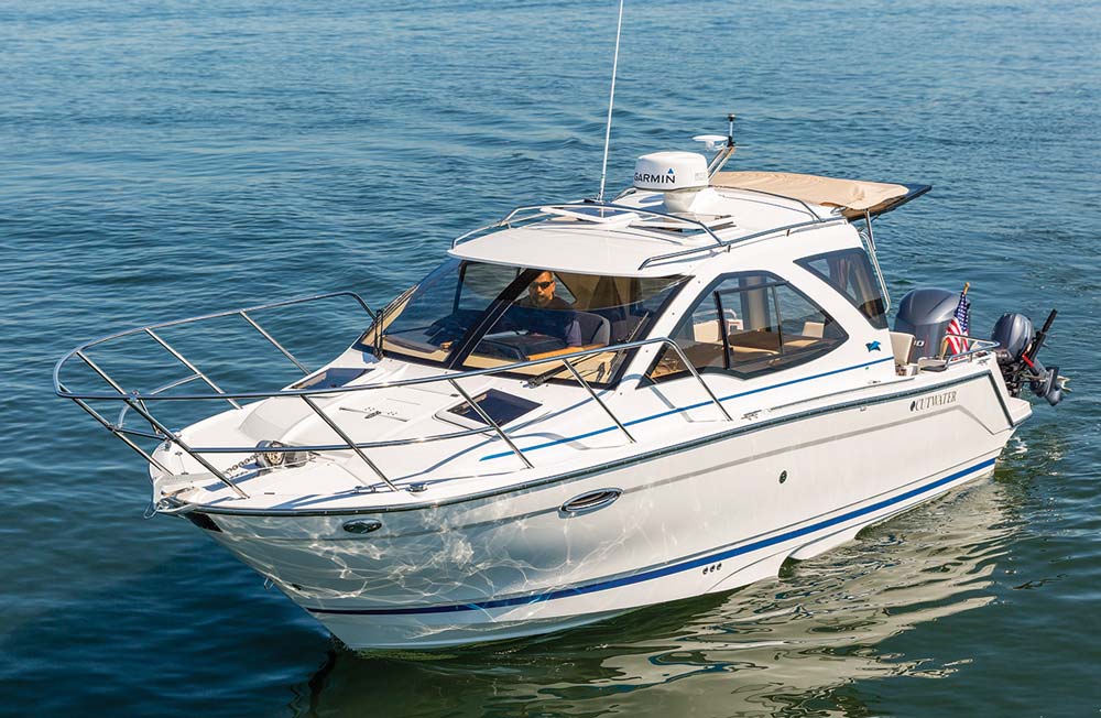 Cutwater’s newest boat, a 24, breaks out of the single-diesel mold by offering a 300-hp Yamaha outboard (though you can order it with a Volvo diesel if you prefer). Designed to get more people into boating, the 24 has a private stateroom in the bow, mid-berth with a mattress, salon that seats four with a dinette that converts to a berth, a private head with shower, an electric/alcohol stove and a fridge/freezer—everything you need to go cruising. The 8′ 6″ beam makes it trailerable, and the outboard performance is head snapping with a top speed of 43.7 mph. The base model includes a Garmin 7610 GPS plotter with a depth sounder and fishfinder.