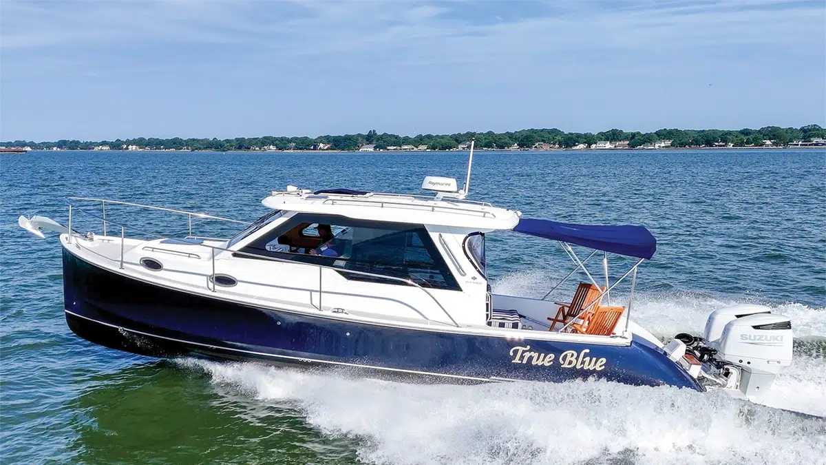 True Blue offers classic looks, remarkable performance, and a sociable layout all within a 34-foot package. This versatile outboard express cruiser excels whether entertaining guests for the day or couples cruising on an extended getaway.
