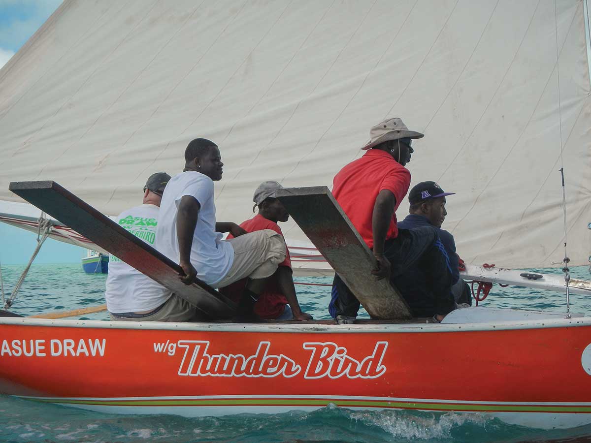 Class C sloop racing is the spectacle that brings many of the visitors to this festival. These are traditional Bahamian boats built entirely of wood and carry a single sail that looks far too big for the boat. Watching them race in a big breeze is an exciting show. By rule, they must be owned, built and sailed by Bahamians. With that huge sail, keeping these boats upright is a challenge. The solution is to use “pry boards” or long planks that are extended out over the side. Up to four crewmen sit out on the boards to counter the force of the sail and keep the boat upright and flat for maximum speed.