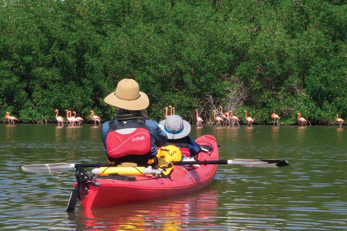 Soon the spell is broken by the hollow thump-thump of paddles against plastic kayak hulls and the happy conversations of my fellow paddlers. The shy flamingos launch into a low, lazy flight and blur past me in a peach-sherbet smear. They climb, circle our boats once and vanish beyond the next bend somewhere deeper in the swamp. I lift my paddle and dig into the water. I’m only a half-mile into today’s five-mile paddle, but already my face hurts from smiling so hard.