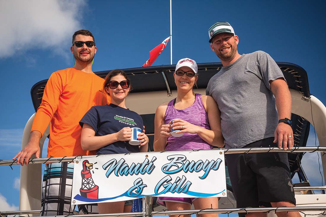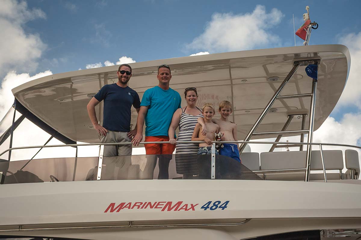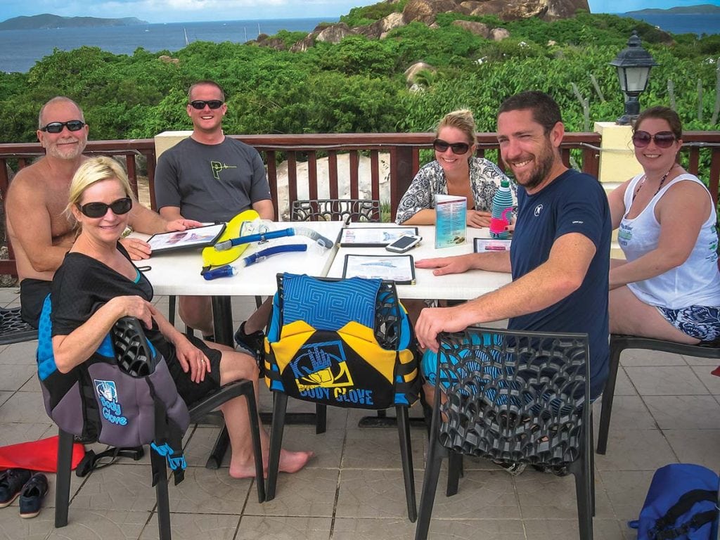 Mooring balls fill up quickly at The Baths, so we departed Cooper Island early the next morning. Our friends enjoyed the trail through the boulders, and we rewarded our effort with a snack at the top of the trail. We met up with MMLOO salesman Kyle Bargfrede and his wife Mandy of Osage Beach, Missouri, their friends Randy and Anna, and Kyle’s customers Rogie Carlock and Shawn Walker. Kyle has been with MarineMax for five years and, in addition to enjoying a vacation with his wife away from their two toddlers, he wanted to see the charter operation firsthand. “The B.V.I. is amazing, a once-in-a-lifetime opportunity for most. Instead of a resort destination trip, you get multiple opportunities and adventures,” says Kyle, who owns two boats: one for watersports and another for fishing. “I can now offer my customers something that no other company does. It shows my customers my company’s commitment to boating and the lifestyle. Now that I’ve done this as a group, I can do it by myself with my own group. It’s given me way more confidence.”