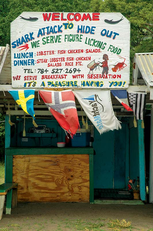 With good light and eyes focused on the crystalline water, it’s possible to thread the unmarked reefs and head out of the Cays’ southern entrance enroute to Union Island, a mere three miles away. Its highest peak, Mt. Parnassus, is nearly 900 feet so you can’t miss it. The main town of Clifton provides great provisioning with an open-air produce market and several grocery stores that sell gourmet coffee, chocolate and bread. A sundowner at Janti’s Happy Island in the harbor is mandatory and can only be reached via dinghy because it was built on the reef out of thousands of conch shells gathered by Janti himself. Clifton is on the windward side and if the weather is a bit sporty, it may be time to hide in Chatham Bay on the western end. This large bay with a long beach has multiple shack-style restaurants advertising lobster dinners.