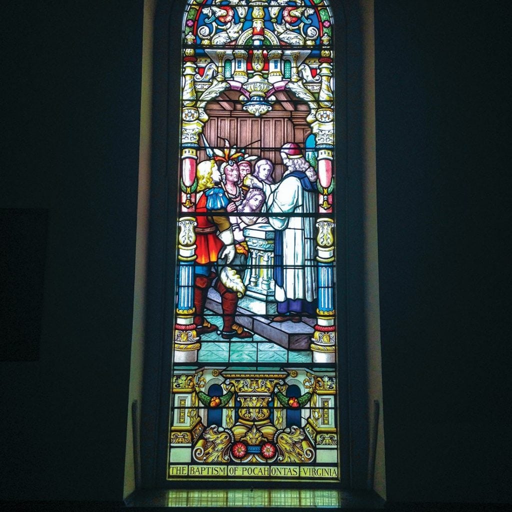 Stained glass depiction of Pocahontas’ baptism, Photo Courtesy Hampton CVB