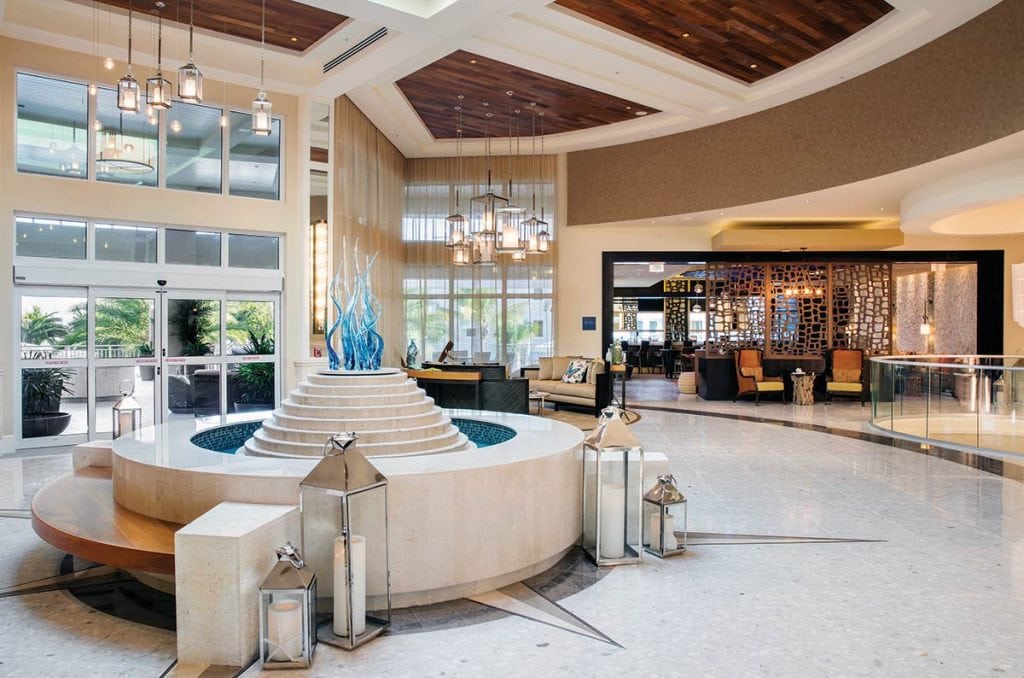 The décor especially reflects the Spanish mariner life. Their ships were built with false interior walls to use for attaching bed frames for officers, and the resort uses contemporary versions in the accommodation’s rooms behind headboards and mirrors, like nautical artwork. In the lobby, hanging chairs are vertical reminders of the horizontal hammocks sailors would sleep on so that they’d move with the ships’ rocking. A compass rose on the marble floor surrounds the fountain, and nautical-themed accouterments are everywhere you look: ship-style lanterns, frosted glass bottles, wooden oars, crab pots, and other curious treasures. “In the 1600s, the Spanish had established their path, already pillaged much of South America, hit the Pacific coast, made their way back, and the trade routes brought them to the Florida Keys. They had the gems and riches but did not have the most important commodity, water, which was more valuable to get them back to Spain,” Calibo details. Their voyage brought them to an island they named Islamorada (“isle of purple”) for its colorful bougainvillea, which is found throughout the resort. Contrary to the pillaging nature of the Spanish explorers, the resort’s construction took great care to protect the existing natural landscape, birds, insects, and other critters.