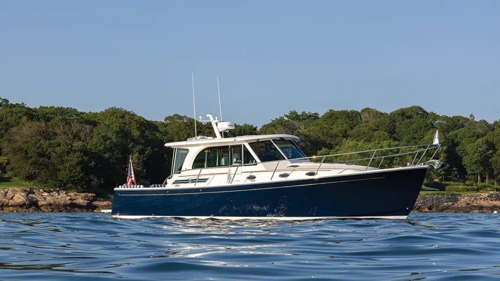 The American Tug 362 (36′ 6″ LOA; 13′ 3″ beam) is a well-equipped coastal cruiser that combines a welcoming two-stateroom layout with a seakindly hull and an ideal 10-plus-knot cruising speed. The salon is open to the pilothouse, and the settee and dinette to starboard convert to an additional berth that allows for six to sleep comfortably. Let her substantial capabilities inspire new cruising goals, be they long weekends off the beaten path or extended voyages beyond the range of your earlier explorations. americantug.com