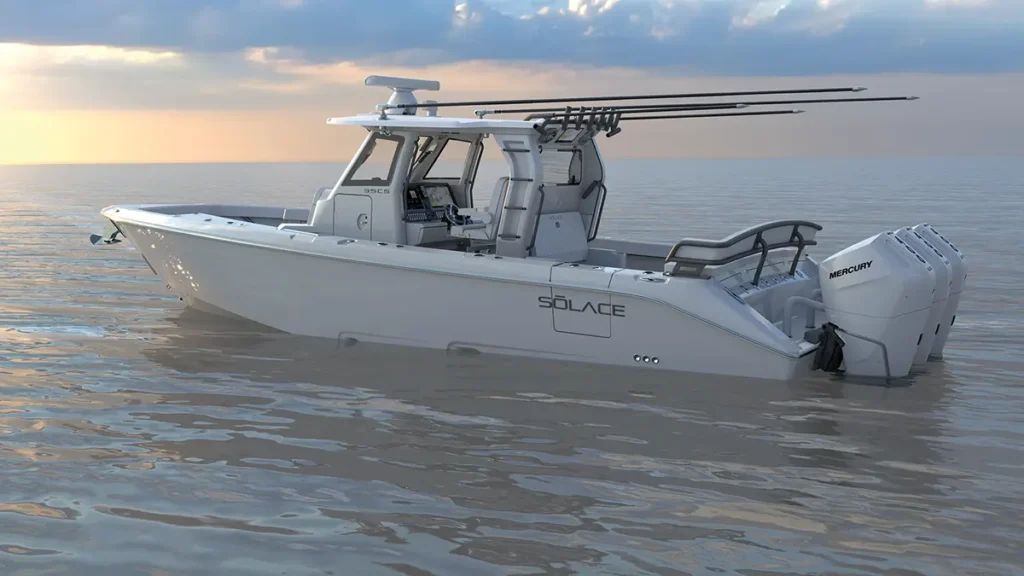 The 35CS joins the SOLACE lineup bridging the 32CS and 37CS. The 35CS (35′ 4″ LOA; 10′ 1″ beam) has the power and capacity to take you where you want to go and return with ease with exceptional performance and advanced fuel efficiency. This model boasts more space in both the cockpit and cabin for passenger usability and comfort, while reimagining the stern area to maximize fishing and cruising space. This new center console underscores the intersection of comfort and capability on the water. solaceboats.com