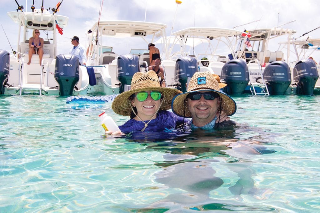 Cat’n Around Bimini is about enjoying what the World Cat catamaran does best: getting the family out on the water. Just a quick ride to the south, past the shipwreck, and over the shallows, the Cats headed down to Honeymoon Harbor at Gun Cay on day three for the Cat Corral Raft-Up. The secluded, lagoon-style beach is known for its protected sandbar and friendly stingrays. A bag of pilchard bait between your toes (or fingers) prompt them to glide by and softly pull the tasty morsel into their mouth. It may be a little unnerving to some, but it quickly becomes part of the fun along with floating about, playing games and enjoying life in the water. (Even a mermaid was spotted swimming around!)