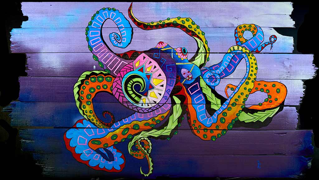 “Octopus Element” began with reclaimed wood and making it truly unique. The wood was acquired from an old Florida Keys’ shack that was being renovated. I used several mediums, such as aerosol, acrylics and oils and wanted to interpret the strange but gorgeous underwater body gliding through our reefs.
