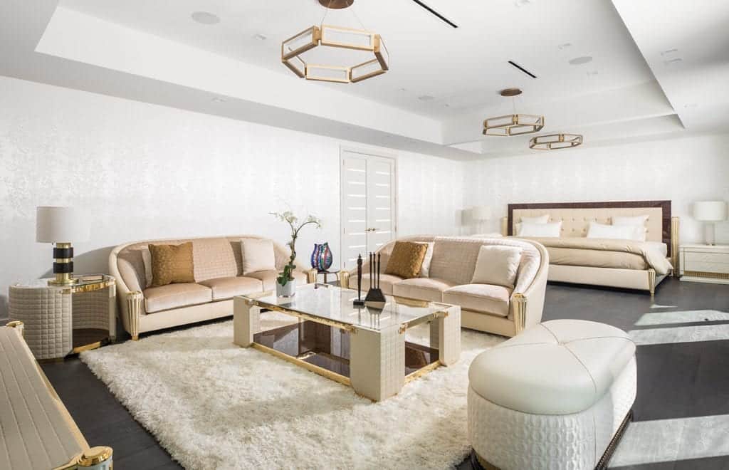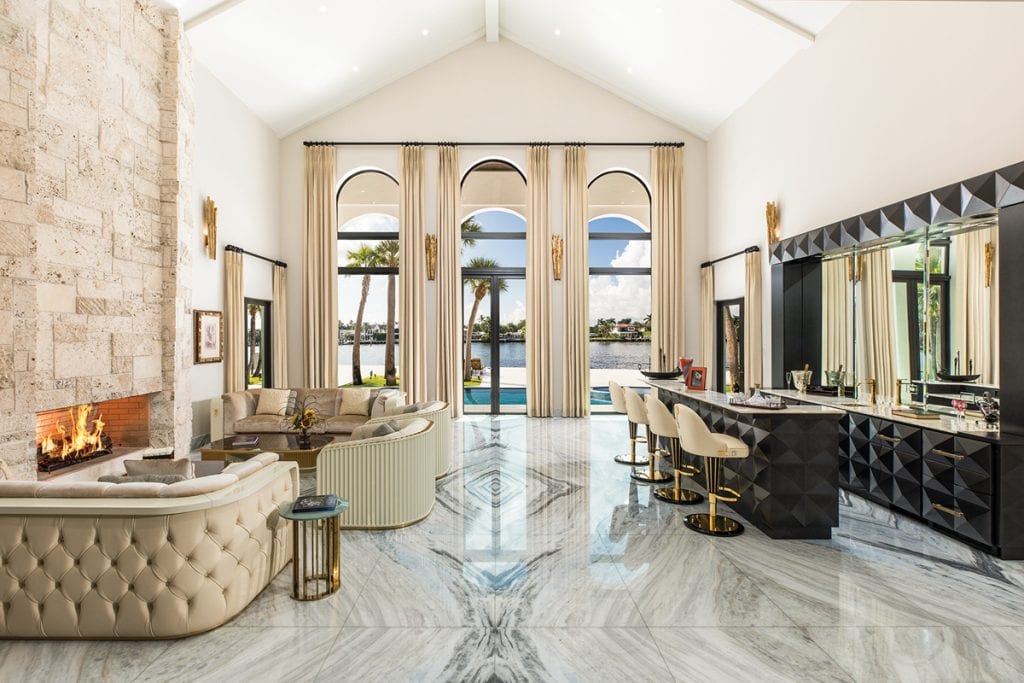 The design starts from the moment you walk in the front door—the eyes are led straight through the entry to the living room, through the large windows and door to the pool framed by the palm trees, and out to the river. The living room’s high ceiling makes you catch your breath as the open space surrounds you. The 10,565-square-foot home has five bedrooms and nine and a half baths, including the 3,000-square-foot master bedroom