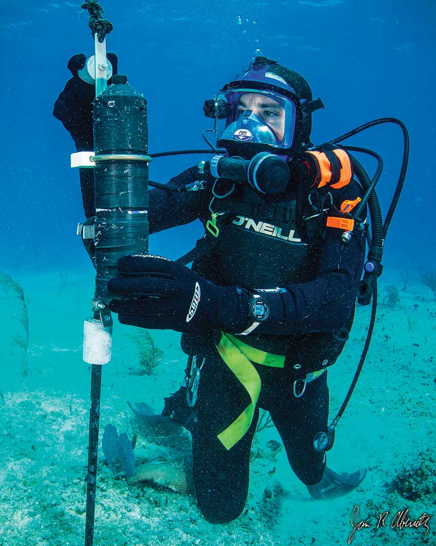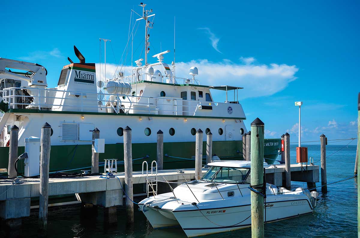 Docked outside the Virginia Key campus is the 96-foot R/V F. G. Walton Smith. Named after the school’s founder, the vessel is a state-of-the-art power catamaran packed with 800 square feet of laboratory space, a nitrox dive center and accommodations for 20 people. She is also equipped with dynamic positioning for exact station keeping, a transducer suite for measuring ocean currents, a dedicated space between the hulls for drilling and coring operations, and a notched stern area for maneuvering equipment into place. To that end, when the environmental disaster caused by the Deepwater Horizon oil well blowout occurred, the Smith participated in aftermath operations.