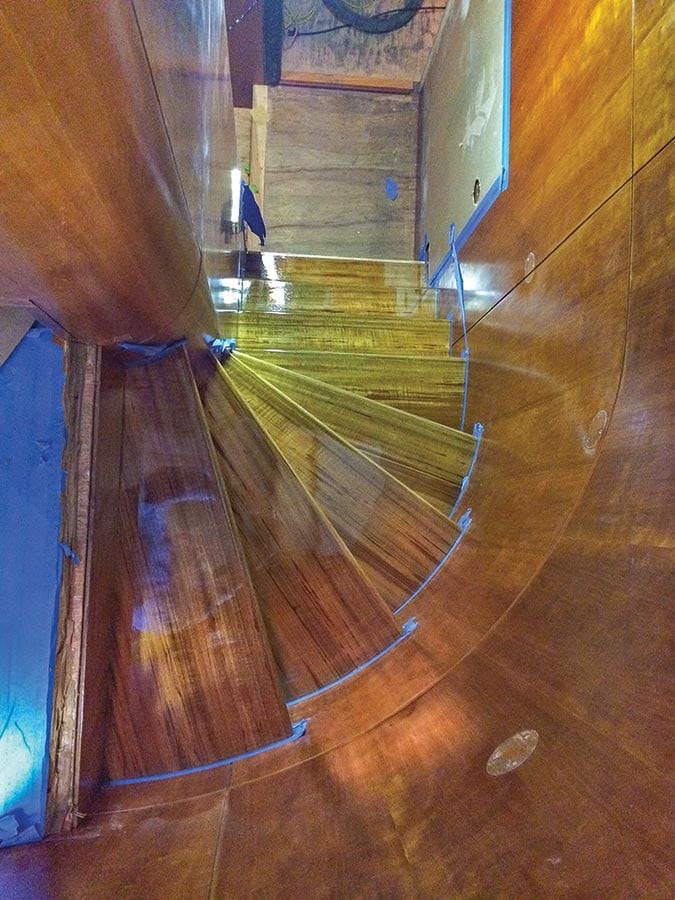 To prepare Asha for extended cruising, the yard replaced all the hydraulic fittings and hoses, refurbished the shafts, flexible couplings and props, added a stern thruster, rebuilt every single pump, rewired the electrical panel, cleaned and recoated the water tanks, upgraded the electronics, and added redundant systems. To make living aboard more pleasant, Front Street put in a new teak and holly sole in the galley, built a new set of teak spiral stairs, installed new granite countertops in the galley and the master head, new stonework in both showers, a heated tile floor in the master head, varnished the wood headboard and countertops in the owner’s cabin, and updated the appliances.