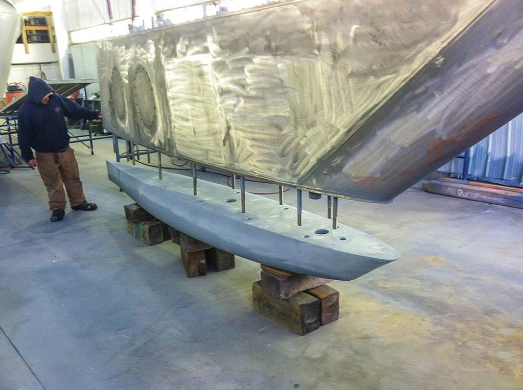 A fast, flush-deck performance cruiser with a long waterline and fairly narrow beam, Diva had already completed a three-year circumnavigation. Launched in 1986, she was one of four Deerfoot 62s built at the Scania yard in Finland. Two had stainless steel keels; two (including Diva) had mild steel keels. The Deerfoot line was conceived by Steve Dashew; Diva was designed by Ulf Rogeberg of Denmark. Ware learned that Diva’s mild steel keel sister ship had already been repaired by Hodgdon Yacht Services in Southport, Maine, just outside Boothbay Harbor. “They knew the boat,” Ware said, “so we had a level of comfort. Plus we saw the capabilities and the scope of the yard.”